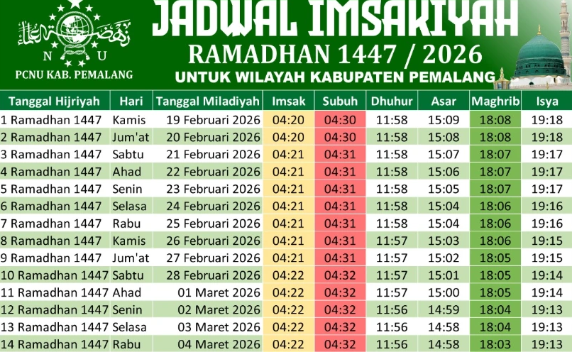Demikian informasi tentang jadwal Jadwal Imsakiyah Ramadhan 1447 H/ 2026 M wilayah Pemalang dan sekitarnya. Semoga bermanfaat dan selamat menjalankan ibadah puasa ramadahan 1447 H bagi warga nahdliyin pemalang dan sekitarnya.