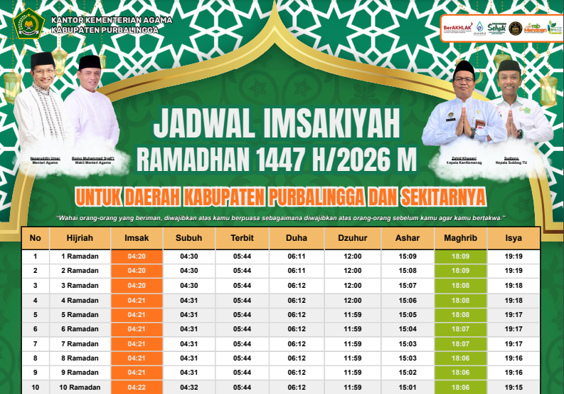 Monggo, Jadwal Imsakiyah Ramadhan 1447 H / 2026 M Wilayah Purbalinggaini disebarluaskan ke grup WhatsApp keluarga, grup tahlil, maupun tetangga sekitar. Mari kita songsong Ramadhan 2026 ini dengan hati yang bersih, niat yang tulus, dan semangat ibadah yang membara.