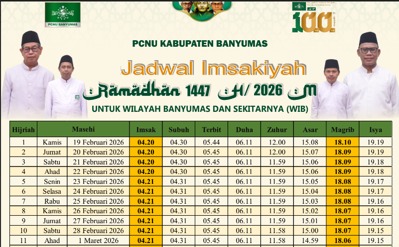 Bagi warga Nahdlatul Ulama (NU) di Kota Satria, memiliki panduan waktu yang akurat adalah hal wajib. Oleh karena itu, nubanyumas.com hadir untuk membagikan link download Jadwal Imsakiyah Ramadhan 1447 H / 2026 M Wilayah Purwokerto Banyumas dan sekitarnya.