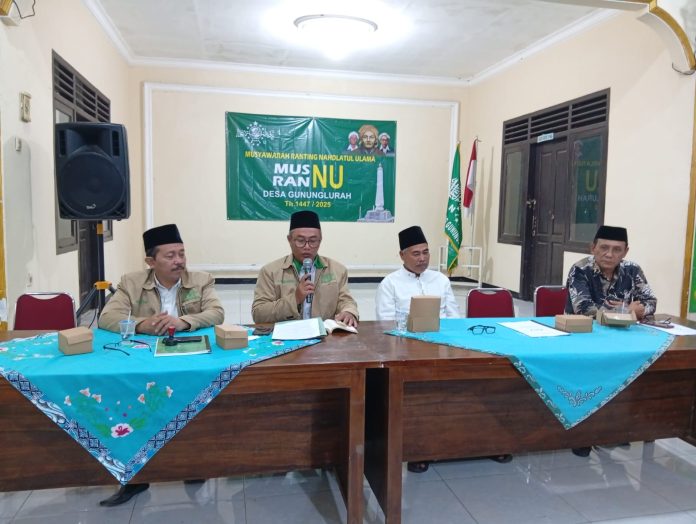 CILONGOK, nubanyumas.com – Nahdlatul Ulama Ranting Gununglurah, Kecamatan Cilongok, Kabupaten Banyumas, menggelar Musyawarah Ranting (MUSRAN) pada Selasa malam (30/12/2025) bertepatan dengan 10 Jumadil Akhir 1447 H. Kegiatan yang berlangsung di Balai Desa Gununglurah tersebut dimulai sekitar pukul 20.30 WIB dan berjalan khidmat dalam suasana kebersamaan warga Nahdliyin.